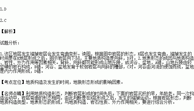 ÏÂÍ¼ÎªÄ³ÇøÓò¹¹ÔìµØÃ²ÆÊÃæÊ¾Òâͼ£¬Í¼ÖеزãÓÉÀϵ½ÐÂÒÀ´ÎΪC¡¢P¡¢T¡¢J¡¢K¡£¶Áͼ£¬Íê³ÉÏÂÁи÷Ìâ¡£