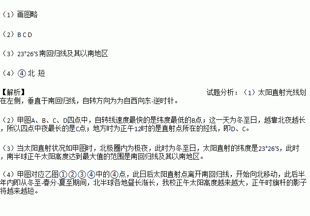 £¨4£©¼×ͼ¶ÔÓ¦ÒÒͼ¢Ù¢Ú¢Û¢ÜÖÐµÄ Î»Ö㬴ËÈÕºóÌ«ÑôÖ±Éäµã¿ªÊ¼Ïò £¨·½Ïò£©Òƶ¯£¬´Ëºó°ëÄêÄÚÄãУ²Ù³¡ÕýÎçʱÆì¸ËµÄÓ°×Ó½«Ô½À´Ô½ £¨³¤»ò¶Ì£©¡£