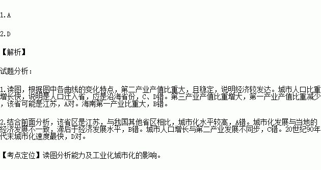 下图为我国某省区三大产业产值比重与城市人口比重的变化图,其中①代表第二产业产值比重的变化,②代表城市人口比重的变化,③代表第三产业产值比重的变化,④代表第一产业产值比重的变化。