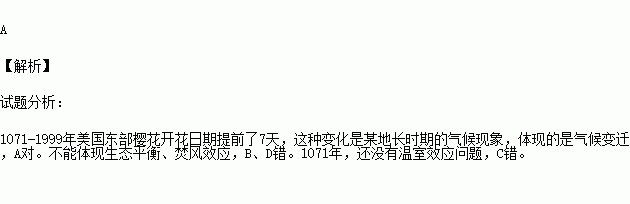 资料显示:“1071-1999年美国东部樱花开花日期提前了7天”。下列最能解释这种现象的是