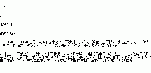 下图为美国乡村、郊区和中心城区人口数量变化图。读图完成下列问题。