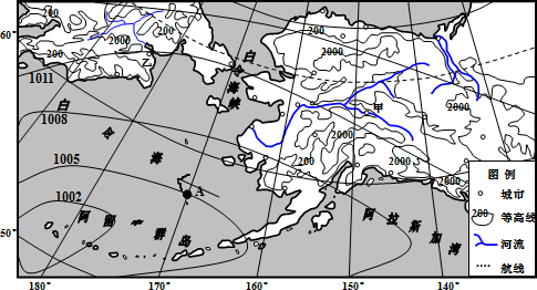 材料一 白令海地区冬季某时海平面等压线示意图.(单位:百帕)