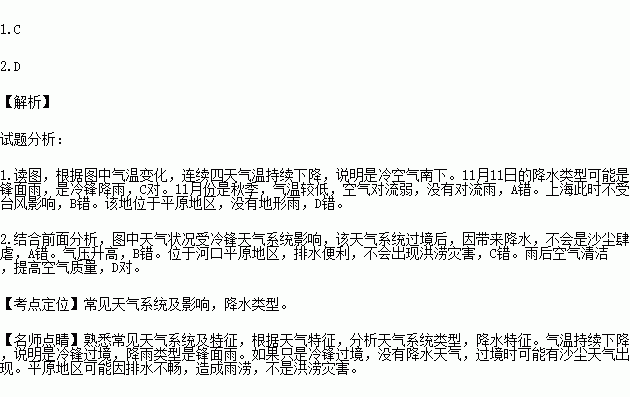 2.若图中天气状况受某天气系统影响,则该天气系统过境后对当地的影响有( )