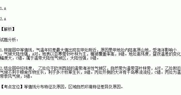 下图为亚欧大陆气温年较差等值线分布示意图(单位:摄氏度),读图回答下列各题。