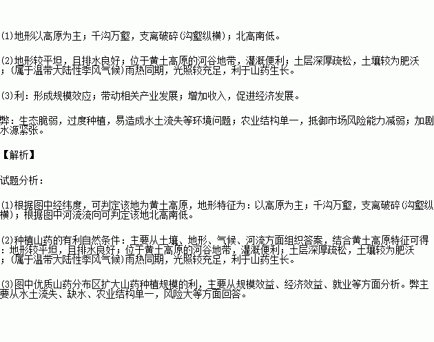 (3)结合材料评价图中优质山药分布区扩大山药种植规模的利弊。