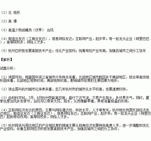 (1)浙江省 (南或北)部城市较密集,影响其分布的主要自然因素是 。