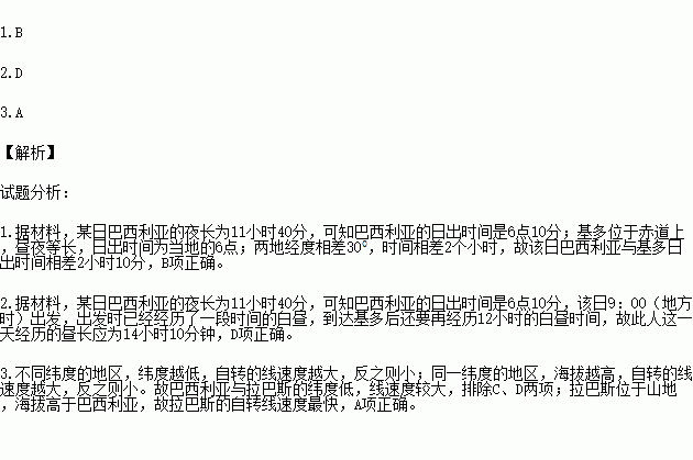 1.该日巴西利亚与基多日出时间相差 ( )