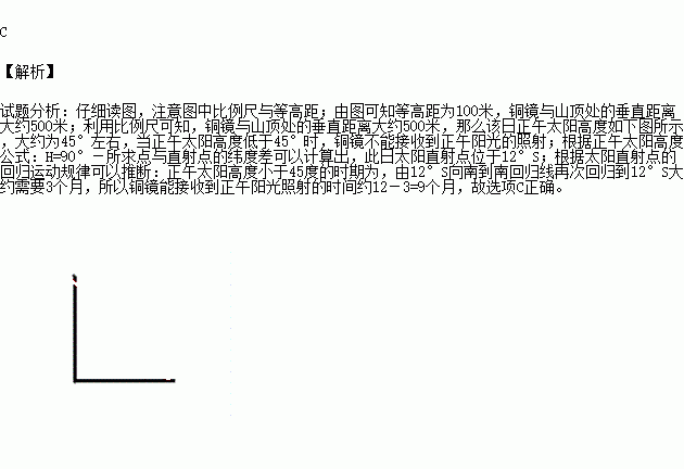 某日,位于铜镜处(33°N)的人们正好看到太阳位于右图中的山顶处。此时,阳光恰好被铜镜反射到陡崖处藏宝洞的洞口。一年中,铜镜能接收到正午阳光照射的时间约