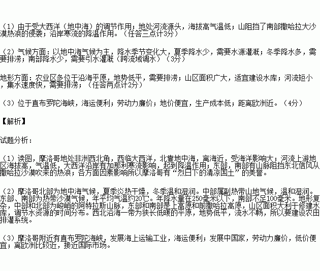 (1)摩洛哥毗邻撒哈拉沙漠,但却有“烈日下的清凉国土”的美誉,试分析乙地“清凉”的原因?(3分)