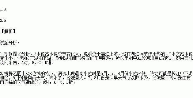 ÏÂͼÖм×ÊÇ¡°ÎÒ¹ú¶«²¿ºÓÁ÷ijºÓ¶ÎʾÒâͼ¡±£¬ÒÒÊÇ¡°ºÓÁ÷A¡¢BÁ½Ë®ÎÄÕ¾²âµÃµÄˮλ±ä»¯Í¼¡±¡£¶Áͼ£¬Íê³ÉÏÂÁи÷Ìâ¡£