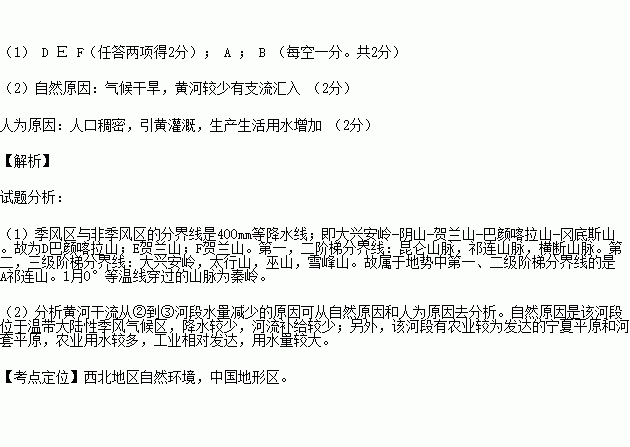 (1)属于季风区和非季风区界线的山脉是(均填字母)________、______;属于地势中第一、二级阶梯分界线的是______;1月0℃等温线经过的山脉是______。(4分)