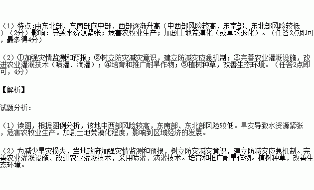 (1)说出该区域旱灾风险的分布特点,并简述旱灾对当地区域发展带来的影响。(9分)