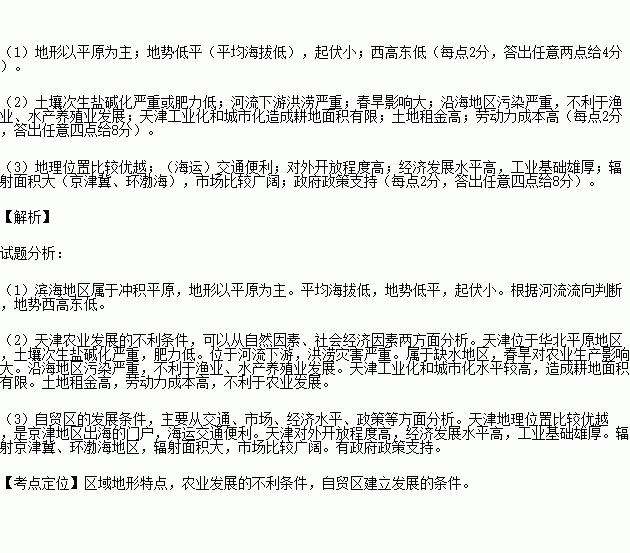 (2)农业为天津最弱势的产业,请分析说明其农业发展的不利条件。
