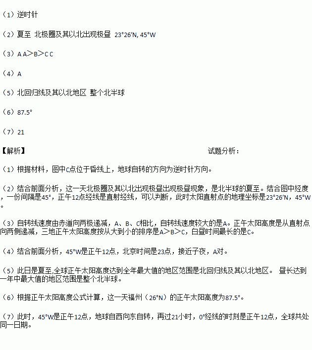 (3)A、B、C相比,自转线速度较大的是 ,三地正午太阳高度按从大到小的排序是