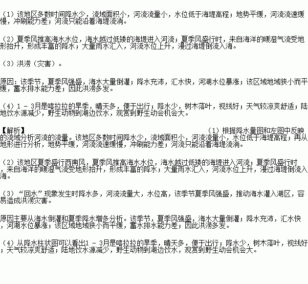 (1)说明喀拉拉“回水”区河流多数时间沿海堤流淌数百千米的原因。