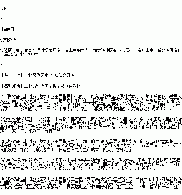 1.通过对雅砻江进行梯级开发,该流域适宜发展的工业是