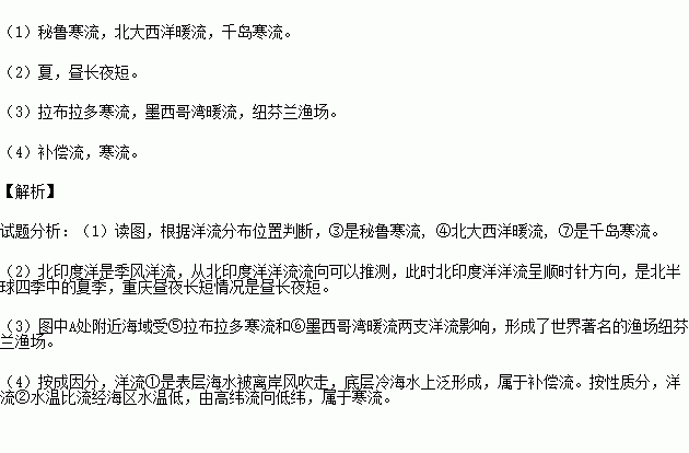 (2)从北印度洋洋流流向可以推测,此时是北半球四季中的 季,重庆昼夜长短情况是 ;