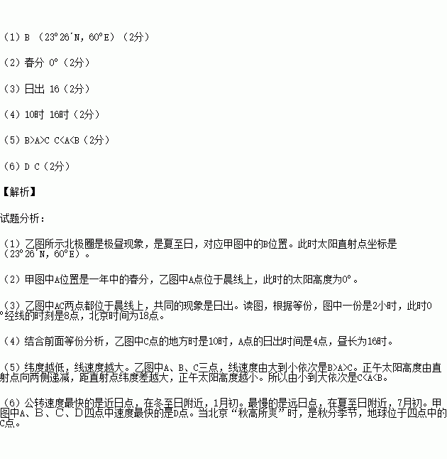 £¨1£©ÒÒͼËùʾµÄ¼×ͼÖÐA¡¢B¡¢C¡¢DµÄλÖÃ________£¬´Ëʱ̫ÑôÖ±ÉäµãµÄ×ø±êÊÇ_______¡£