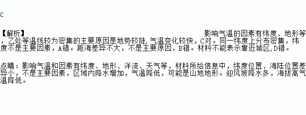 下图是我国东部某地区年降水量和一月份平均温度分布示意图。乙处等温线较为密集的主要原因( )