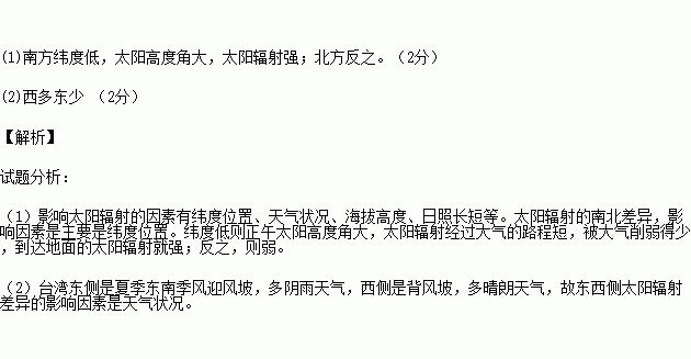 (1)台湾太阳总辐射量分布南多北少的原因是什么?(2分)