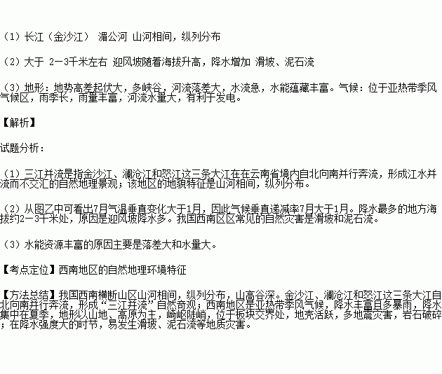 £¨2£©Í¼ÒÒÊÇ¡°¡®Èý½²¢Á÷¡¯ËùÔÚµØÇøÆøÎ¡¢½µË®Á¿Ó뺣°ÎµÄ¹ØÁªÊ¾Òâͼ¡±¡£Í¼ÖÐµÄÆøÎ´¹Ö±µÝ¼õÂÊ7Ô (´óÓÚ»òСÓÚ) 1Ô£»ÕâÀオˮ×î¶àµÄµØ·½Î»ÓÚº£°ÎÔ¼ Ã×µÄɽÆÂÉÏ£¬³öÏÖ¸ÃÏÖÏóµÄÔÒòÊÇ £»¸ÃµØÇø³£¼ûµÄ×ÔÈ»ÔÖº¦ÓÐ ¡£
