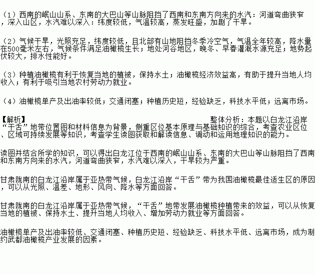 ¸ÊËà¤Äϵİ×Áú½Ñذ¶ÊôÓÚÑÇÈÈ´øÆøºò£¬Ä꽵ˮÁ¿³ý¸ßÉ½ÇøÍ⣬¶¼ÔÚ500ºÁÃ××óÓÒ£¬ÄêÈÕÕÕʱÊýΪ1789¡ª1911Сʱ£¬ÐγÉÓÉÎ÷±±Ïò¶«ÄÏÑÓÉìµÄ¡°¸ÉÉࡱµØ´ø¡£¡°¸ÉÉࡱ´øÑذ¶º£°Î1300Ã×ÒÔϵĺӹȼ°°ëɽÑü£¬±»È·ÈÏΪÎÒ¹úÓÍéÏé×î¼ÑÊÊÉúÇø¡£½üÄêÀ´£¬Â¤ÄÏÎä¶¼¿ªÊ¼´ó¹æÄ£ÖÖÖ²ÓÍéÏ飬ĿǰÒѳÉΪÖйú×î´óµÄÓÍéÏé»ùµØ£¬µ«ÓÉÓڸõØÇøÓÍéÏéµ¥Î»Ãæ»ý²úÁ¿¼°³öÓÍÂʽϵ͵ÈÖî¶àÒòËØ£¬ÖÆÔ¼ÁËÎä¶¼ÓÍéÏé²úÒµµÄ·¢Õ¹¡£ÏÂͼʾÒâ°×Áú½Ñذ¶¡°¸ÉÉࡱµØ´ø¡£