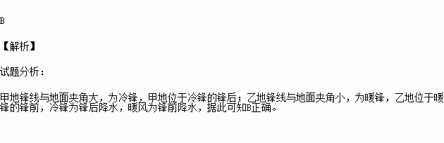 下图是某日影响甲地(110°E、40°N)和乙地(120°E、45°N)的天气系统的垂直剖面图”,在该天气系统的影响下,乙地的雨区表示正确的是