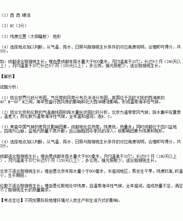 (4)从北京、成都、伦敦三地中任选一地,判断该地是否适合种植猕猴桃,并说明理由。(答出两点即可)