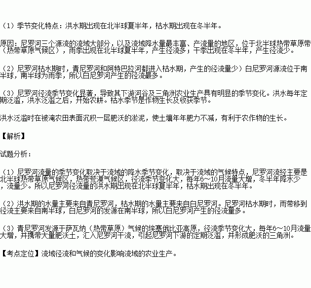 (1)分析尼罗河径流量的季节变化特点及原因。