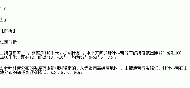 1.据图计算,水平方向的针叶林带分布的纬度范围约为