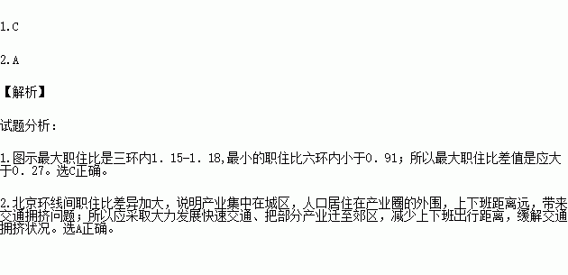 职住平衡是指城市在规模合理的范围内所提供的就业岗位数量与该范围内居民中的就业人口数量大致相等,且大部分有工作的居民可以就近工作。通常用职住比来评价一个地区的职住平衡状况,计算公式为:职住比=就业岗位数量/居民中的就业人口数量。下图是2015年北京环线之间职住比分布图。据此完成下列问题。