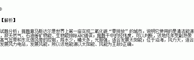 马斯达尔市位于阿拉伯联合酋长国首都阿布扎比(约北纬24ºN,54ºE)附近。该城市计划于2016年成为世界上第一座实现CO2“零排放”的城市。为实现零碳城市的目标,其供电的能源主要是: