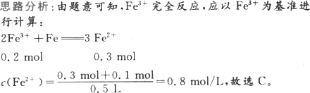 某500 mL溶液中含0.1 mol Fe2+、0.2 mol Fe3+,加入0.2 mol铁粉,待Fe3+完全被还原后,溶液中的Fe2+的物质的量浓度为(假设反应前后体积不变) | |