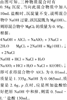 把由NaOH、AlCl3、MgCl2三种固体组成的混合物,溶于足量水中,有0.58 g白色沉淀析出,向所得的浊液中,逐滴加入0.5 mol·L-1的盐酸,加入盐酸的体积和生成沉淀的质量如图所示: