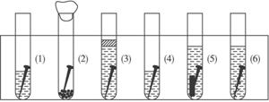 °Ñ6Ö§ÊԹܷÅÔÚÊԹܼÜÉÏ£¬¼¸Ììºó¹Û²ìÌú¶¤±»¸¯Ê´µÄÇé¿ö£®ÆäÖÐ_________ÊÔ¹ÜÄÚµÄÌú¶¤Î´±»¸¯Ê´£®´ÓÌú¶¤±»¸¯Ê´µÄÇé¿ö¿ÉÖªÒýÆðºÍ´Ù½øÌú¶¤¸¯Ê´µÄÌõ¼þÊÇ_________£®