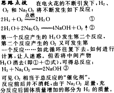 小结点评:中间产物是指前一个反应的生成物恰又是后一个反应的反应物所对应的物质,它不是起始投料,像本题中H2O为中间产物,O2是起始投料,在这里相当于“催化剂”.将中间产物消去(进行方程式的加合)目的是产生一个新的反应方程式,计算时可以看清反应物质实际消耗的情况.例如,当H2O、CO2与少量的Na2O2反应时,究竟何者先反应消耗掉呢?不妨假设先发生反应:2H2O+2Na2O2 |
