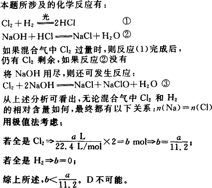标准状况下,a L由Cl2和H2组成的混合气在光照下充分反应,反应后的气体恰好能使b mol NaOH完全转化为盐,则a、b间不可能的关系是 | |