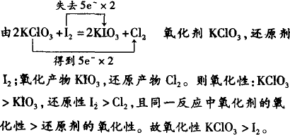 在一定条件下,氯酸钾与碘按下式发生反应:2KClO3+I2=2KIO3+Cl2,下列相应结论错误的是( ). | |