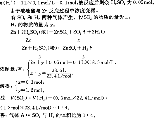 使一定质量的Zn与100 mL 18.5 mol/L浓硫酸充分反应,Zn完全溶解,同时生成标准状况下的气体A33.6 L.将反应后的溶液稀释至1 L,测得溶液c(H+)=0.1 mol/L.求气体A中各组分的体积比.