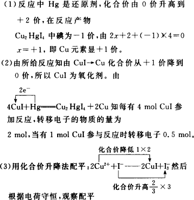 (1)上述反应产物Cu2HgI4中,Cu元素显________价.