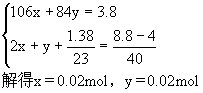 | 依题意,得到的8.8g白色固体为碳酸钙和氢氧化钠混合物,4g固体只为碳酸钙,其物质的量为: 设碳酸钠的物质的量为x,碳酸氢钠的物质的量为y 依据钠元素守恒,金属钠、碳酸钠与碳酸氢钠中钠原子的总物质的量等于8.8g固体中氢氧化钠的物质的量,可以列方程组: 所以碳酸钠的质量:0.02×106=2.12g,碳酸氢钠的质量:0.02×84=1.68g