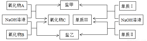 解析试题分析:氧化物A是光导纤维的基本原料,则A是二氧化硅。二氧化硅和氢氧化钠溶液反应删除硅酸钠和水,则甲是硅酸钠,C是水。单质Ⅰ和氢氧化钠溶液反应生成硅酸钠,则单质Ⅰ是硅,所以单质Ⅲ为氢气。单质Ⅱ为主族元素对应的金属单质,且和氢氧化钠溶液反应生成氢气,所以该单质Ⅱ是铝,则乙是偏铝酸钠,偏铝酸钠水解,溶液呈碱性。氧化物B和氢氧化钠溶液反应生成偏铝酸钠和水,因此B是氧化铝。