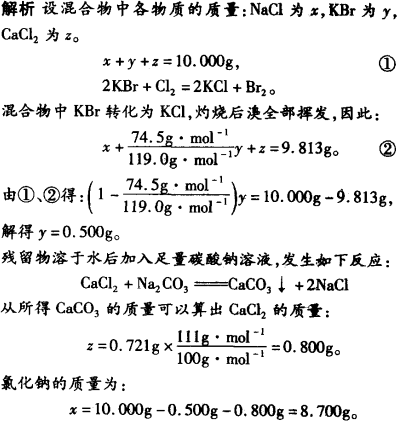 答案:NaCl为8.700 g,KBr为0.500 g,CaCl2为0.800 g |