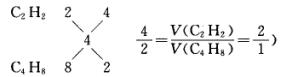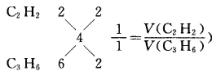 + (x+ 依题意: 即混合烃的平均组成为CxH4 讨论:(1)若烯烃、炔烃分子中氢原子数均为4,则该烃由乙烯(C2H4)和丙炔(C3H4)组成,其体积比为任意比. (2)若烯烃分子中氢原子数大于4,则炔烃分子中氢原子数必小于4,必为乙炔,所含烯烃为C3H6或C4H8.所以混合烃的组成有两种可能:C2H2和C3H6或C2H2和C4H8. 用十字交叉法计算混合烃中各种烃的体积比: ① 若混合烃由C2H2和C3H6组成: