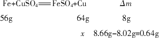 将 8.02 g铁片放入1.0 L 0.90 mol/L CuSO4溶液中,过一段时间取出洗净、干燥后称量,质量变为8.66 g.假设溶液的体积无变化,则Cu2+的浓度变为 | |