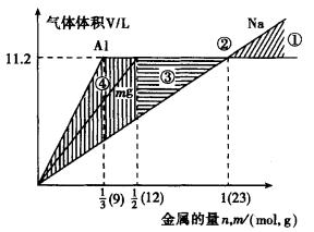 由图可清楚地看出,在阴影部分①的区域内V(Na)>V(Mg)=V(Al)=11.2L,此时n>1mol, 在图所示的②,V(Na)=V(Mg)=V(Al)=11.2L,此时n=1, 在阴影部分③,V(Mg)=V(Al)=11.2L>V(Na),此时 在阴影部分④,V(Al)>V(Mg)>V(Na),此时 答案:①n>1 ②n=1 ③
