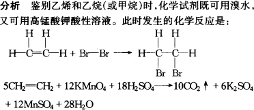 答案:将被鉴别的气体分别通入溴水(或KMnO4酸性溶液),观察现象.使溴水(或KMnO4酸性溶液)褪色的是乙烯气体,不能使溴水(或KMnO4酸性溶液)褪色的气体是乙烷. 除去气态烷烃中的乙烯气体化学试剂可用溴水,但不可用高锰酸钾酸性溶液和溴的四氯化碳溶液.这是因为混合气体通过高锰酸钾酸性溶液和溴的四氯化碳溶液后,乙烯气体除掉之后,会混入新的杂质气体. |