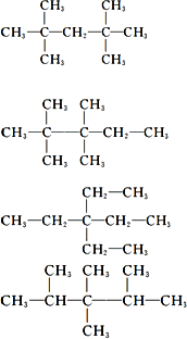 通常,烷烃可以由相应烯烃经催化加氢得到.但是,有一种烷烃A,分子式为C9H20,它却不能由任何C9H18的烯烃催化加氢得到.而另有A的三个同分异构体B1、B2、B3,却分别可由而且只能由一种自己相应的烯烃催化加氢得到.则A、B1、B2、B3的结构简式分别为________、________、________、________.