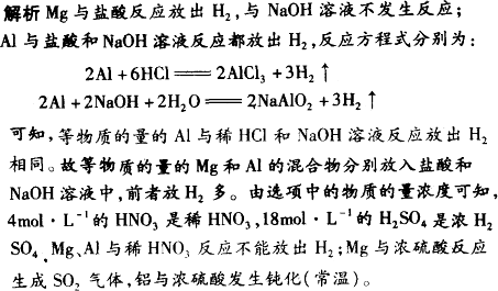 将等物质的量的镁和铝相混合,取四份等质量的该混合物分别加入到足量的下列溶液中,充分反应后,放出氢气最多是( ). | |