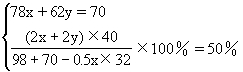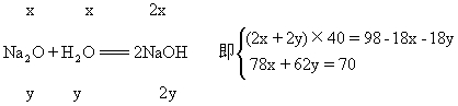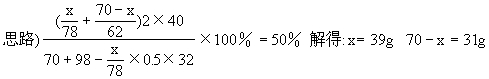 Na2O质量为(70-x)g(同上解法 解得:x=39g 70-x=31g 解法四 设混合物中含xmol Na2O2,ymol Na2O 根据题意,反应后所得NaOH溶液的质量分数50%,也就是说NaOH和H2O的质量相等,得 2Na2O2+2H2O===4NaOH+O2↑ 解得x=0.5mol Na2O2为78×0.50=39(g) y=0.5mol Na2O2为62×0.50=31(g) Na2O2、Na2O质量分别为39g、31g